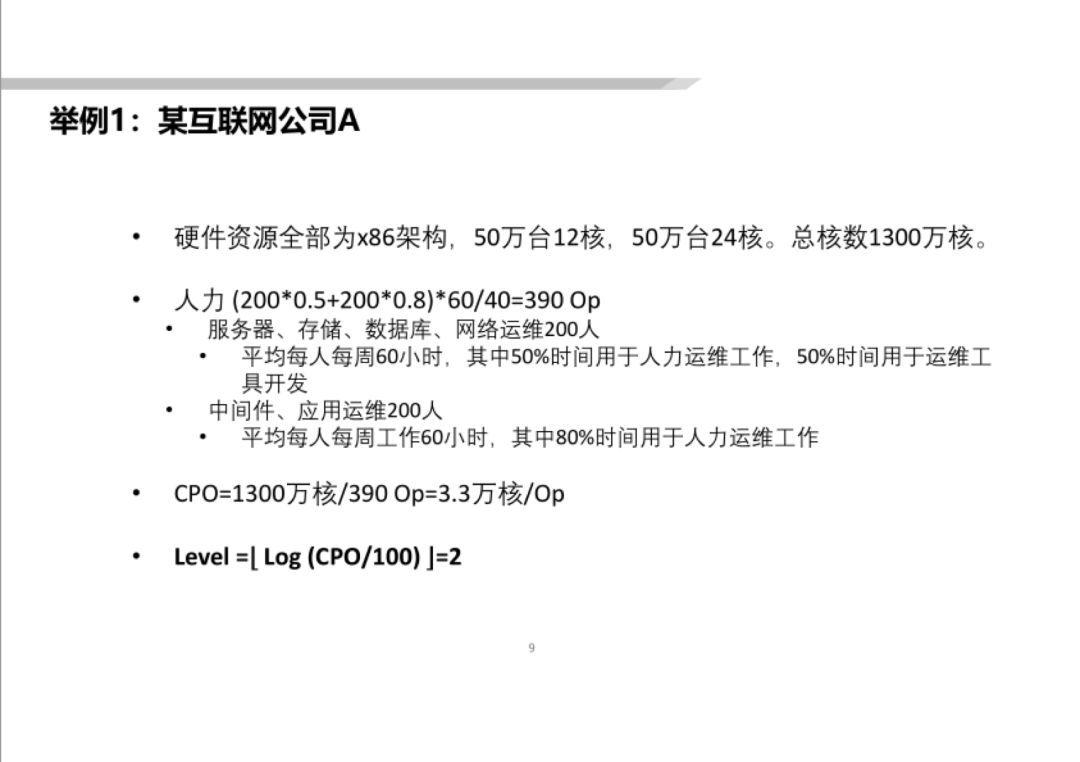 互联网公司B(见下图)运维水准要比A高一些: 总核数同样是1300万,,,,但是总人力核算下来只有130 Op,,用相同方法计算下来是Level 3, A高一级,,,表示其智能化程度更高。。
