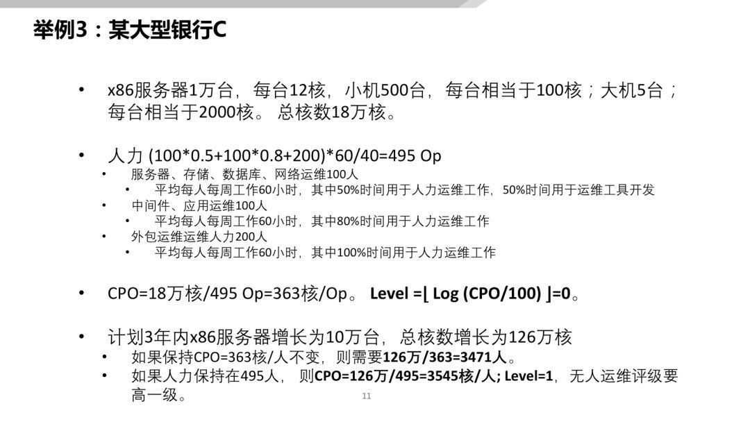 如果保持运维水准不变(即每个运维人力管理363个核),,则需要人力增加10倍,,达到3000多人;但如果人力只能保持300多,,,,这就必须提升自动化运维的水平,,,无人运维评级相应需要从0级升为1级。。。这是同一个机构通过CPO和无人运维评级进行自我纵向比较和规划的例子。。。