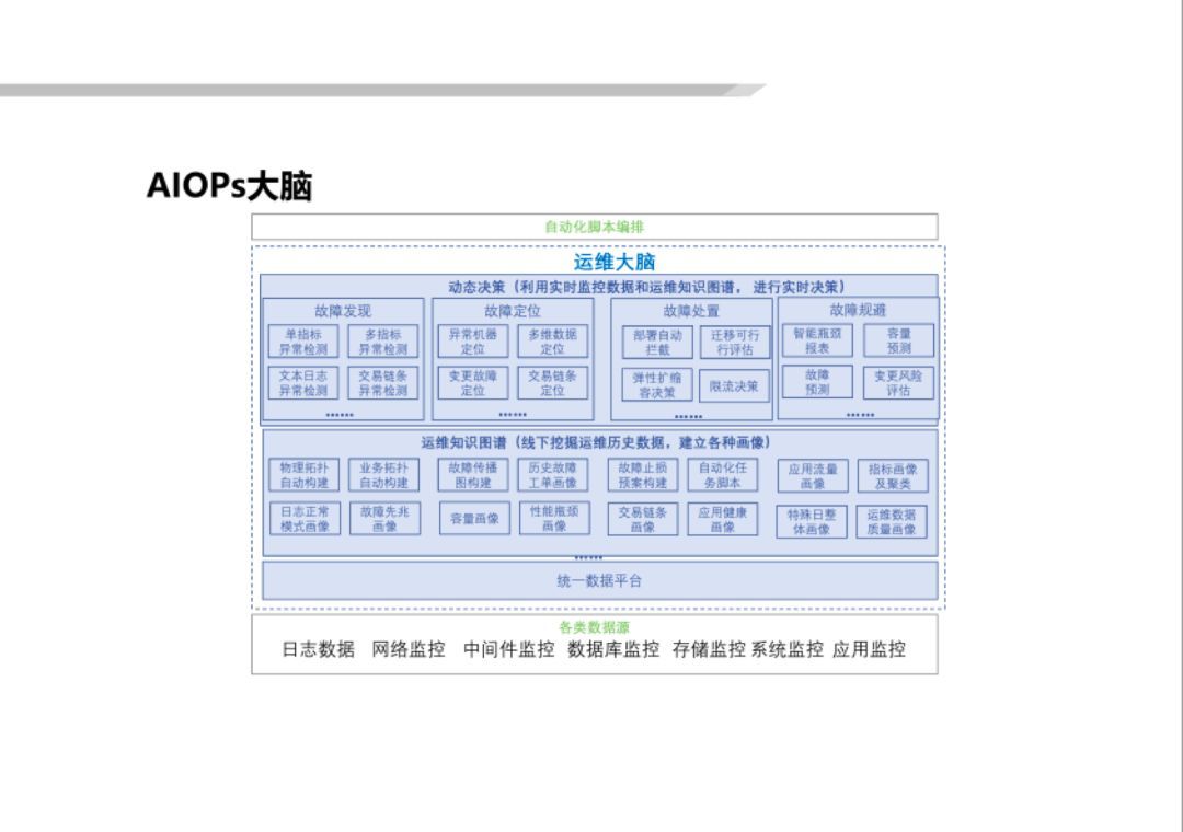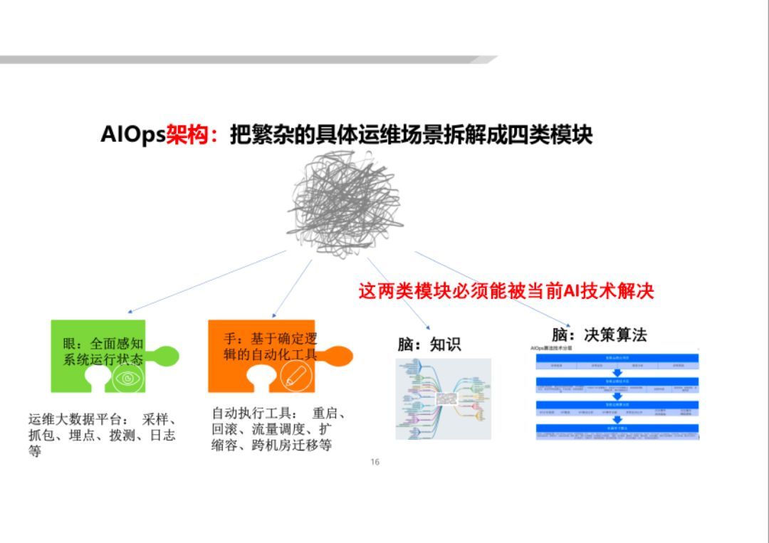 中间部分是大脑,,,就是AIOps,,它以眼睛感知到的数据作为输入,,,,做出实时的运维决策,,从而驱动执行一些自动化的操作。。。。