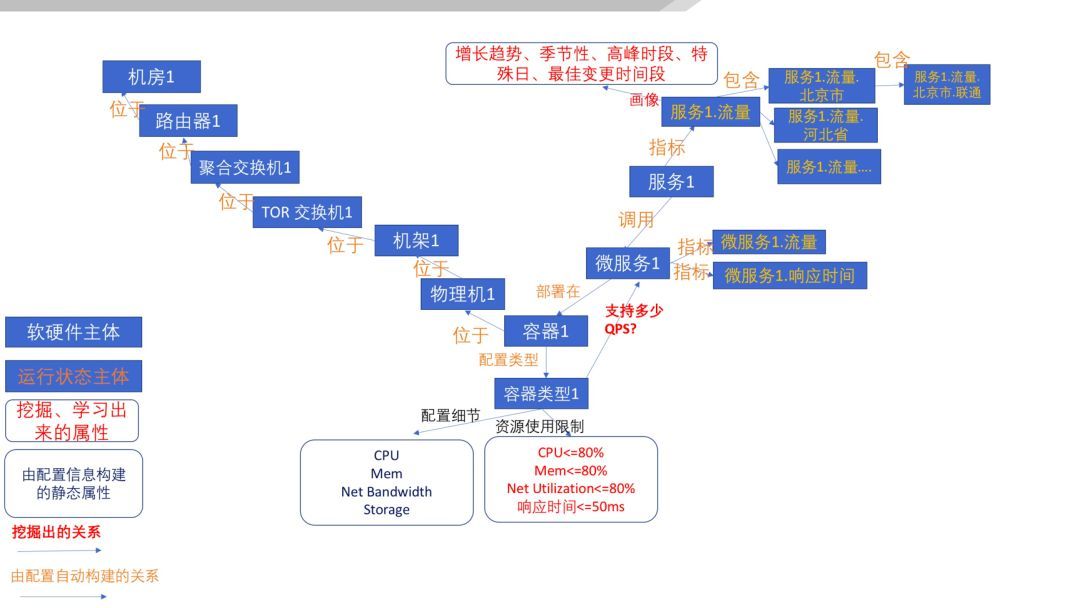 这种关系也是通过确定逻辑基于配置信息自动构建的(橙色的边属性)。。。那么,,,容器类型1可以支持微服务1每秒钟多少次的交易呢(容器类型1与微服务1之间的边的红色属性)??这个属性需要通过历史数据、、、、压测数据构建动态的画像。。。。