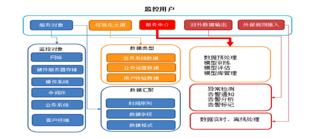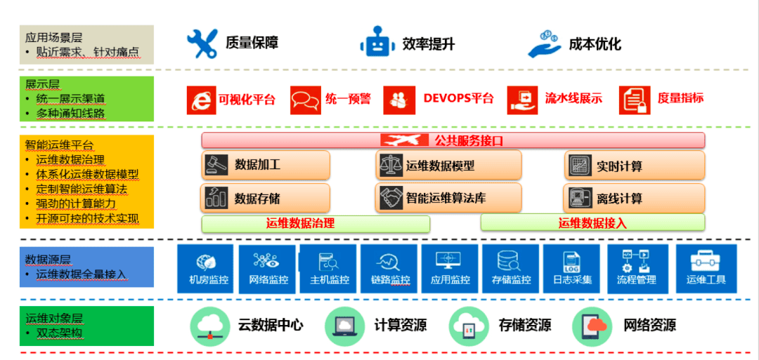 在运维领域来说,,,,业务保障域是监控平台的核心功能,,,,具备全方位无死角的监控覆盖范围,,,以业务为顶层视角,,系统为主体数据输出模式,,,对故障进行检测、、、、诊断、、、、恢复、、、、预测,,其中故障预测是基于运维经验沉淀和积累的结果,,对数据的分析来总结出故障的模式,,从而进行预测。。在IT数字化方面,,,,监控数据是重要的数据资产,,,因此监控平台需要承担核心数据集散地的作用,,,,为业务数据提供补全,,为技术数据提供支撑。。在成本预测方面,,容量管理和采购管理需要相应的资源利用率提供数据支撑,,,还包括投入产出比来进行优化建议。。。
