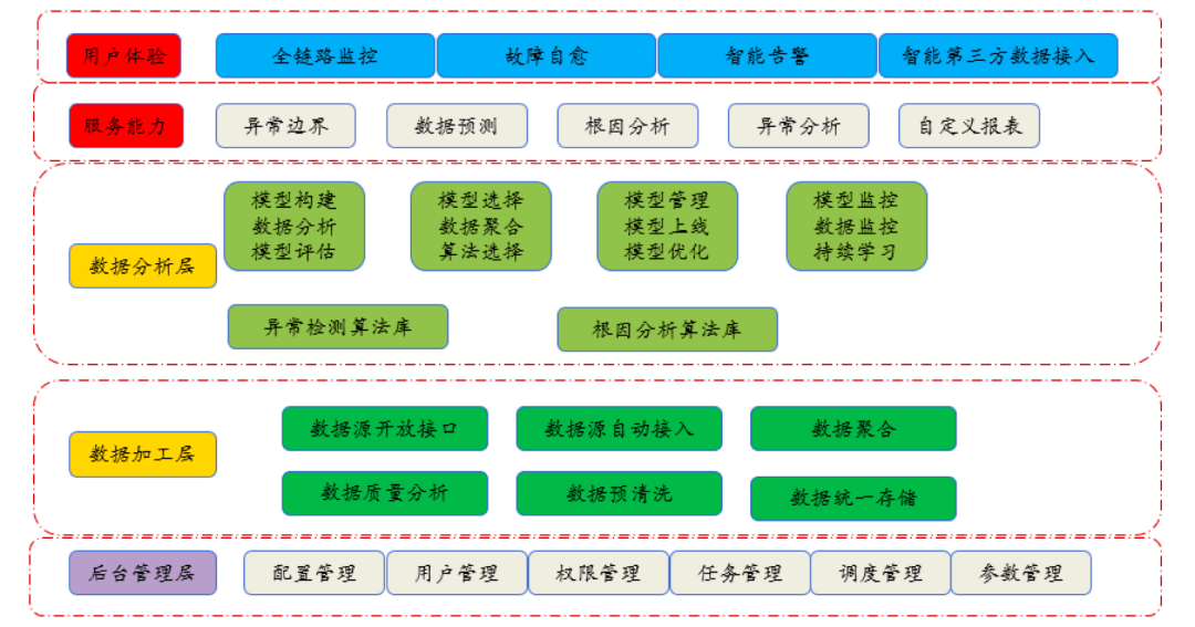 在基于面向终态的监控平台设计中,,,,平台应有如下分层。。。。①用户体验层;②服务能力层;③数据分析层;④数据加工层;⑤后台管理层。。。